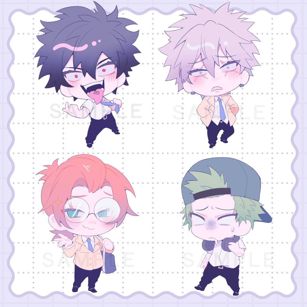 3” with colorful acrylic boards to match the characters accent colors. Each one has a different expression on the back.
